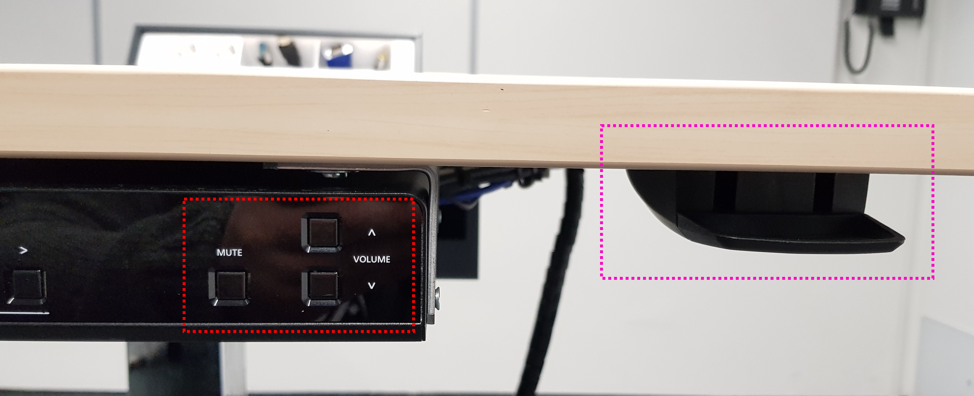 Audiosignale werden bei Nutzung der HDMI Displayverbindung direkt digital mit über HDMI und bei Nutzung der VGA Verbindung über das separate Audiokabel mit Klinkenstecker zum Pult übertragen. Beide Signalquellen sind gleichberechtigt im Scaler zusammengeführt und benötigen keiner direkten oder besonderen Selektion. Am Scaler befinden sich Kontrollen zur Lautstärkekontrolle und Stummschaltung (im Bild unten rot markiert). Bei Nutzung gibt es im Beamerbild eine direkte Rückmeldung über den Zustand der aktuellen Audiosignaleinstellungen.