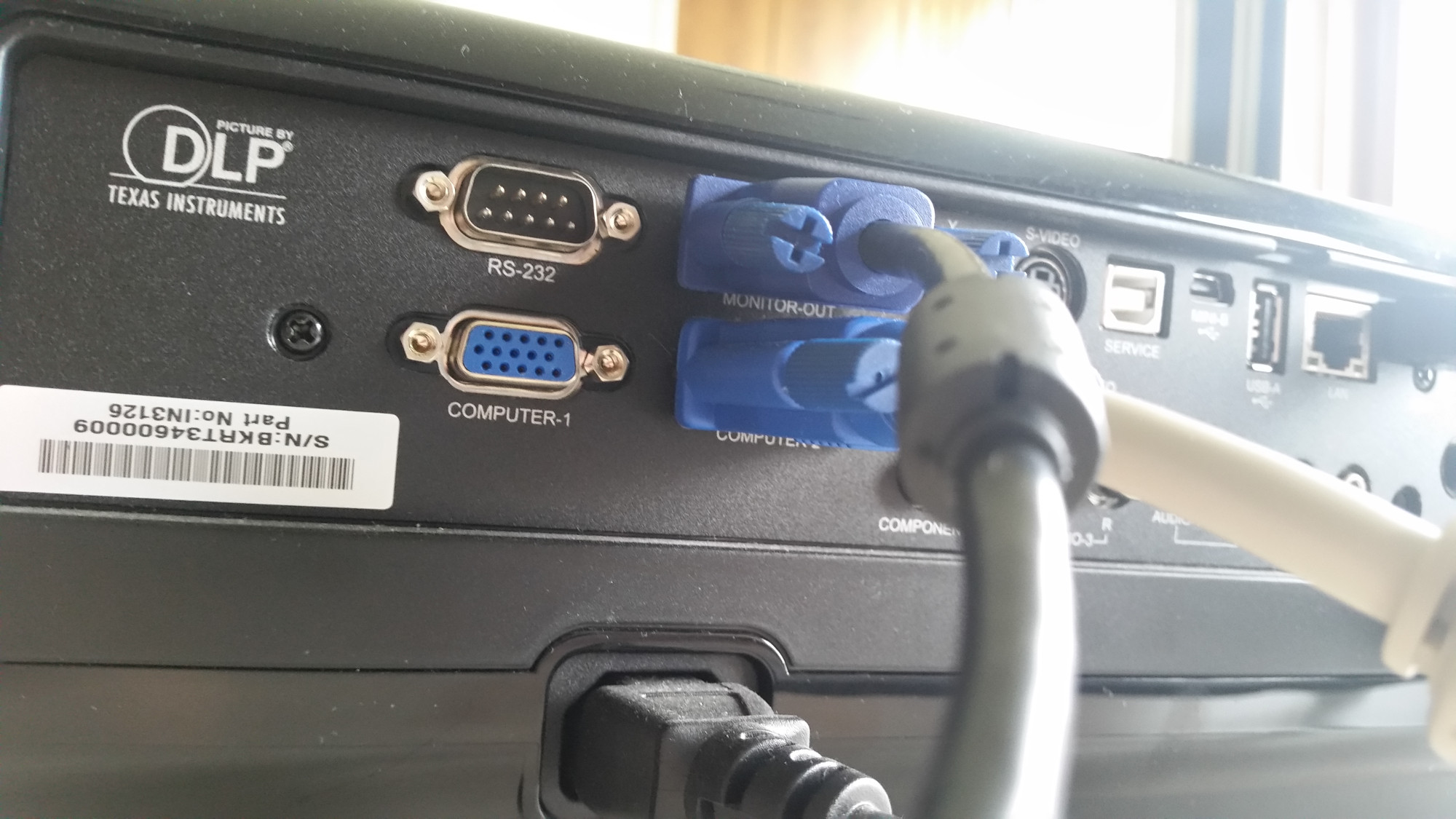 Verbinden sie ihren Laptop wie immer mit dem VGA Kabel mit dem im Raum installierten Beamer.