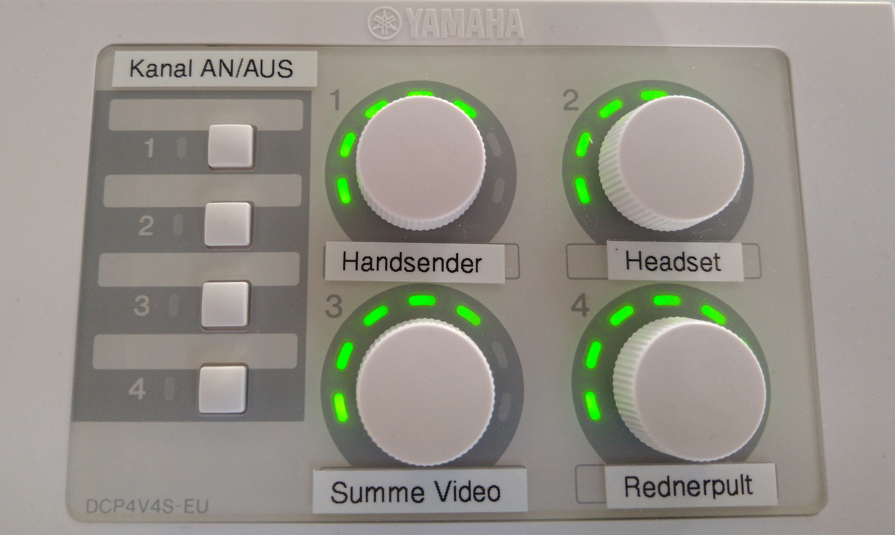 Kanal 3 steuert die Lautstärke des HDMI- oder Klinkenaudiosignals, Kanal 4 die des fest installierten Mikrofons am Pult. Die Kanäle lassen sich über die Taster links neben den Reglern individuell an- und ausschalten.