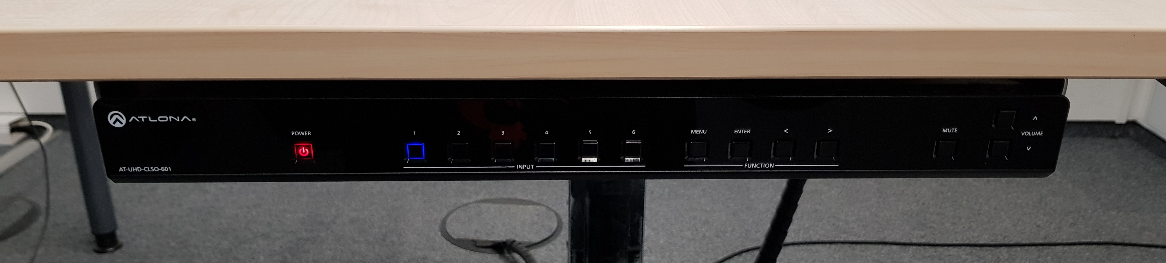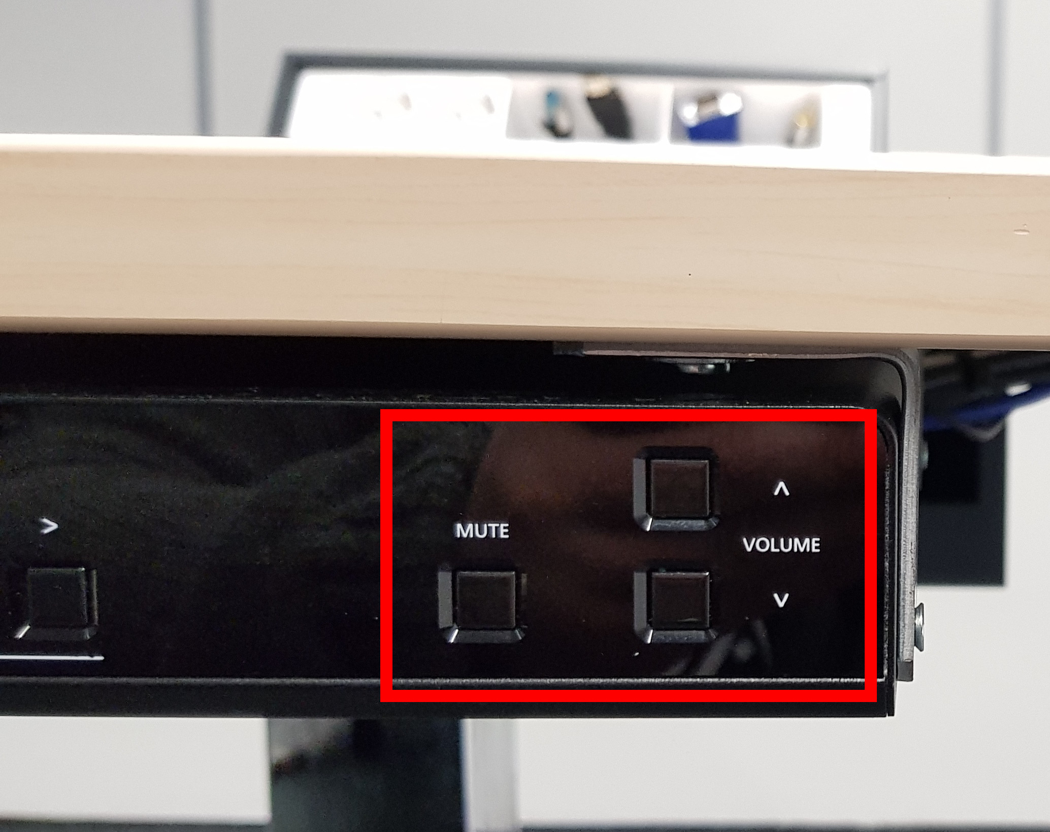 Audiosignale werden bei Nutzung der HDMI Displayverbindung direkt digital mit über HDMI und bei Nutzung der VGA Verbindung über das separate Audiokabel mit Klinkenstecker zum Pult übertragen. Am Scaler befinden sich Kontrollen zur Lautstärkekontrolle und Stummschaltung (im Bild unten rot markiert). Bei Nutzung gibt es im Beamerbild eine direkte Rückmeldung über den Zustand der aktuellen Audiosignaleinstellungen. Bitte beachten Sie, dass derzeit eine Nutzung des Klinkensteckers nur möglich ist, wenn man das Bild über VGA überträgt. Bei Nutzung der HDMI-Verbindung muss das Audiosignal mit über HDMI ausgegeben werden.
