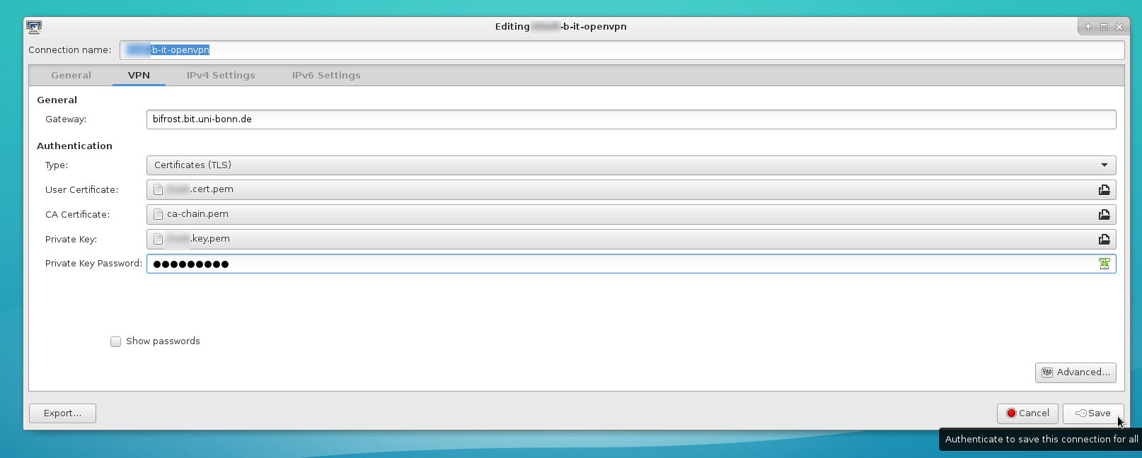 Im nächsten Dialog wählen sie bitte die Schlüssel-, Zertifikats- und CA-Chain Dateien dem Feldnamen entsprechend aus und tragen sie bei Bedarf ihre Passphrase ein. Speichern sie das neue Profil ab und starten sie es durch Auswählen über das kleine Networkmanager Icon im Systray-Bereich ihrer Desktopumgebung.