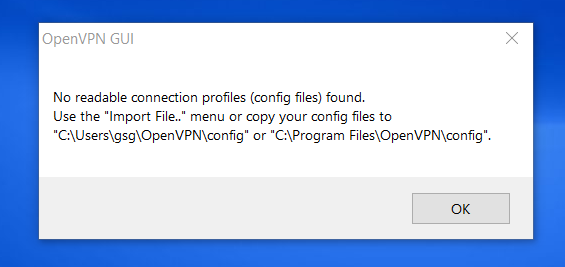 Wenn Sie die Standardeinstellungen nicht verändert haben, wird die GUI ab sofort bei jedem Neustart/Relogin autmatisch gestartet. Beim ersten Start wird die OpenVPN GUI Sie informieren, dass noch keine Profile installiert sind. Lassen Sie sich davon nicht irritieren, die GUI läuft danach trotzdem im Hintergrund weiter.